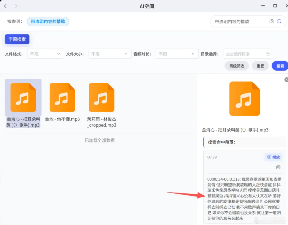 对于媒体创作者而言,AI空间的价值远不止于搜索。在处理大量素材时,传统方式需逐个播放视频或音频查找特定内容,而AI空间可通过语义理解快速筛选。例如,搜索带流泪内容的情歌,系统能根据歌词、歌名信息精准定位相关音频;搜索演唱会,则能快速找出所有演出视频。这种所想即所得的搜索体验,大幅提升了内容创作效率。